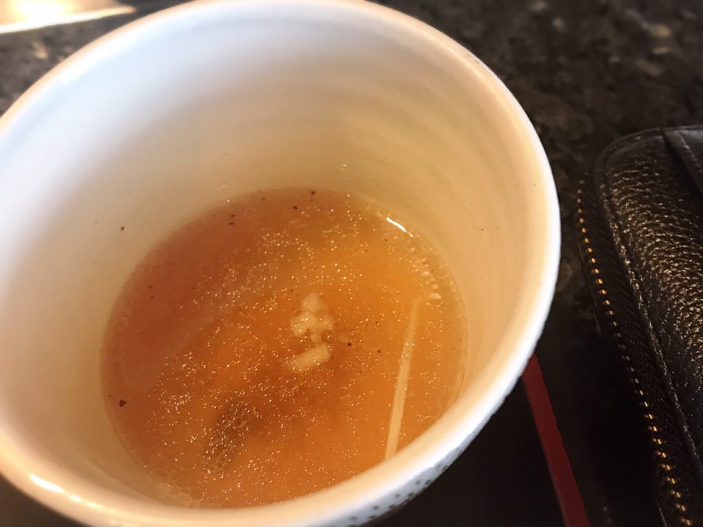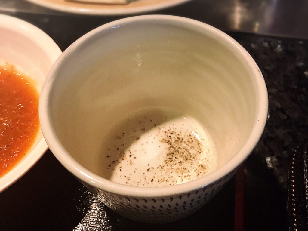 お肉とお野菜を食べ終わったら、店員さんが猪口にしゃぶしゃぶのお出汁をおたまですくって入れてくれ、最後のシメにスープを飲めます~~