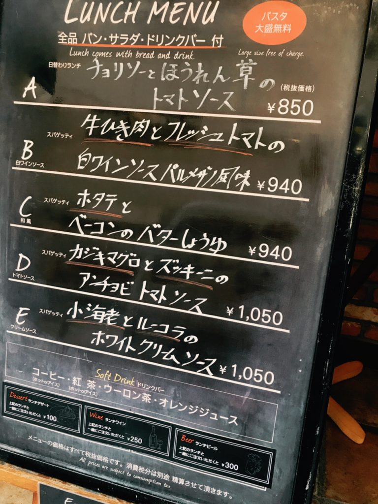 PASTA&PIZZAと看板には書いてありますがランチはパスタメニューのみ。