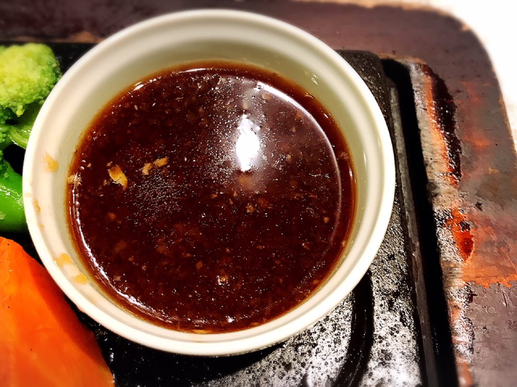 溶岩石があっつあつなので、ソースはかけずに、ハンバーグをソースにディップして食べるのがルール!