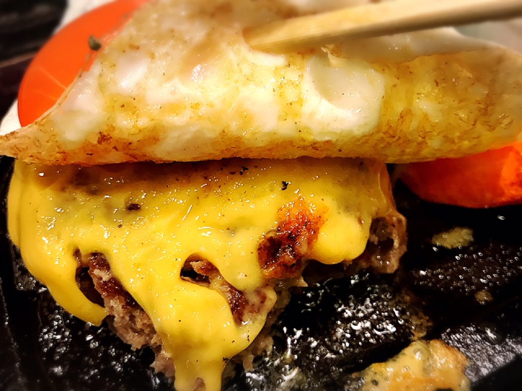 目玉焼きめくるとチェダーチーズがハンバーグに溶けてる。
